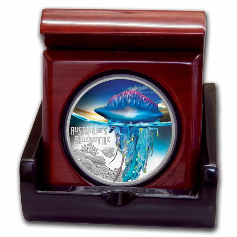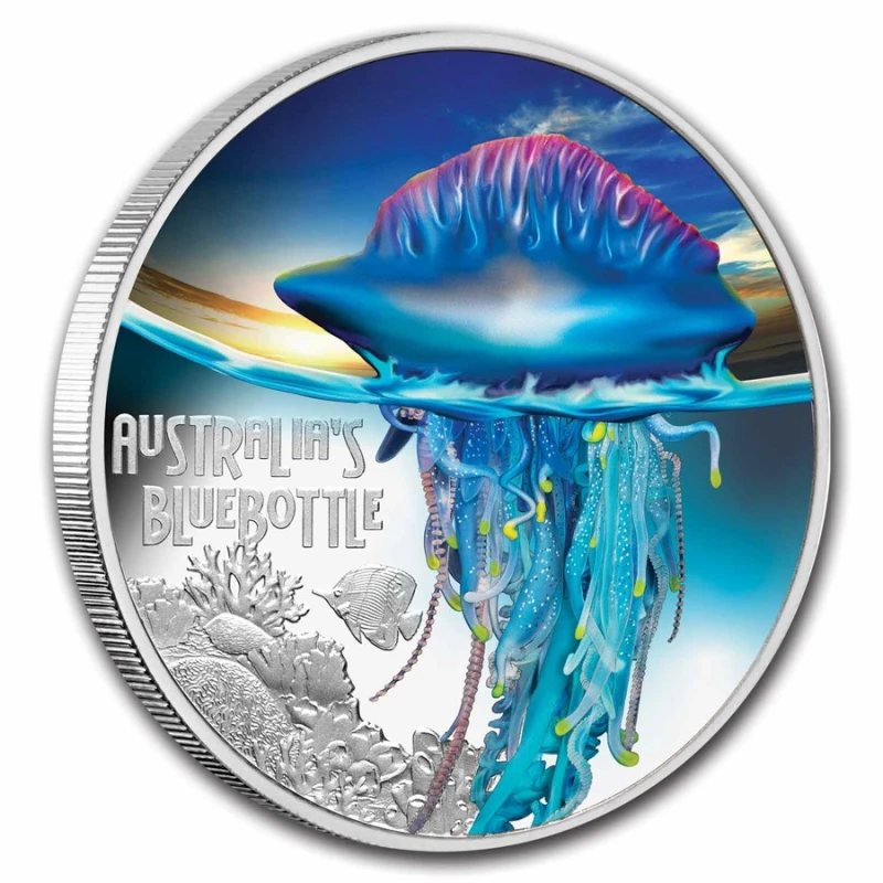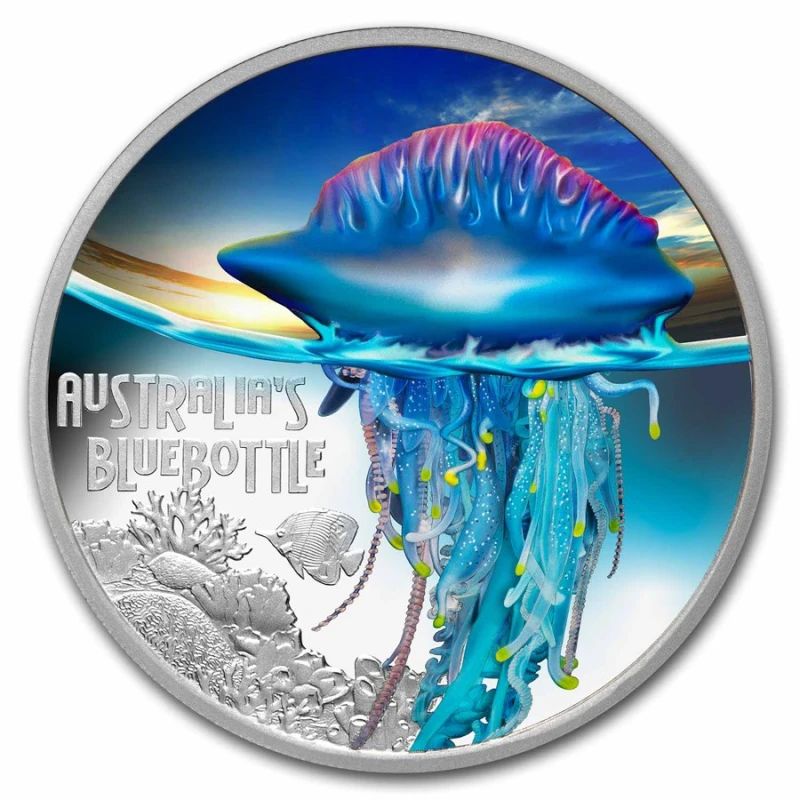 Silver coin Niue "Jellyfish - Blue Bottle" (proof, colorized) 2024, 31,1 g pure silver (0,9999 proof).