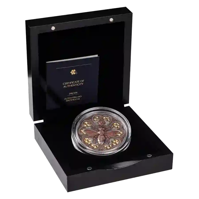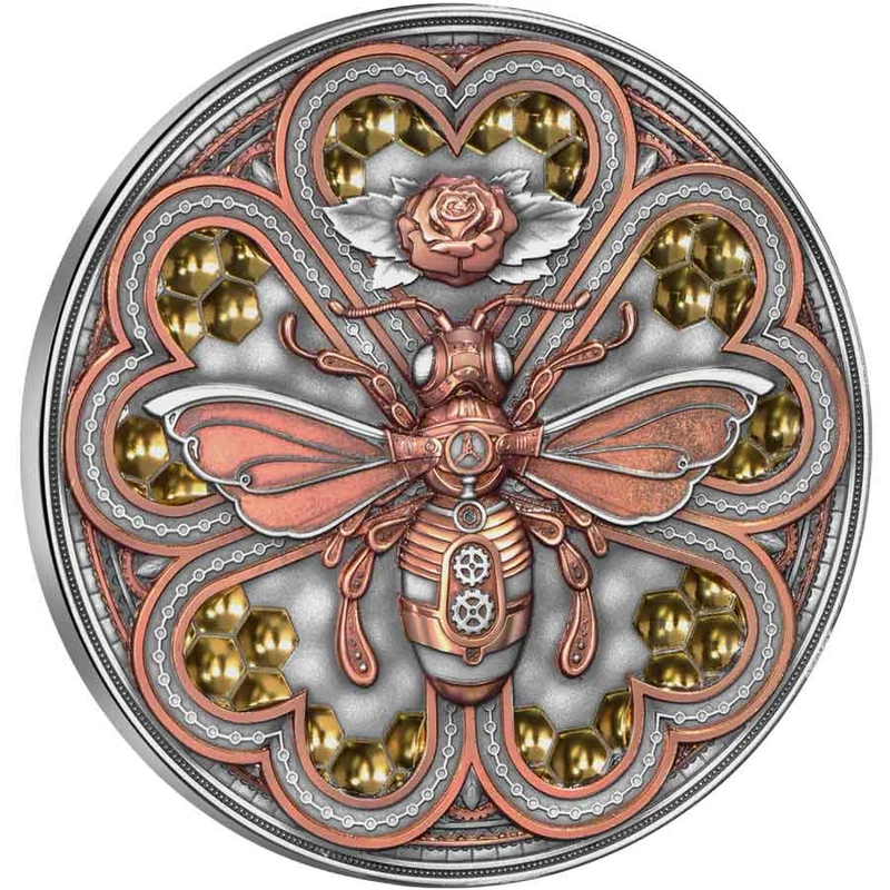This unique silver coin issued by the island of Niue comes in an expensive, lacquered precious wood package complete with certificate. The reverse of the coin depicts a mechanical bee in the steampunk style, with inherent gears, hinges, all sorts of screws and nuts and other breakthrough technologies of the XVIII-XIX centuries.