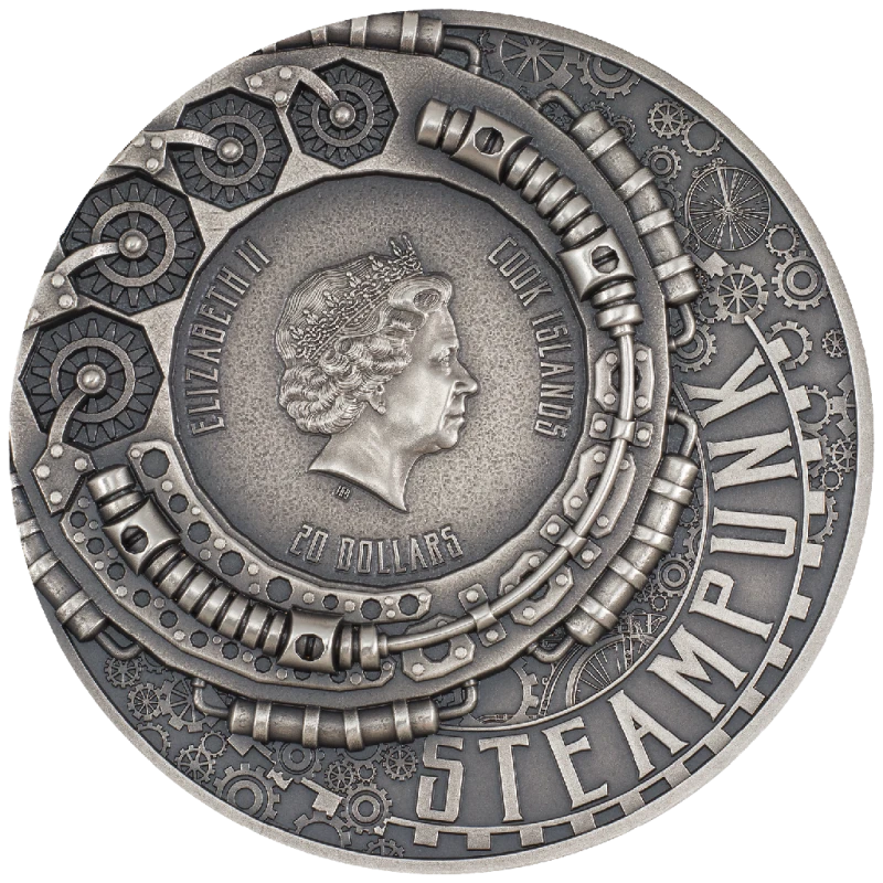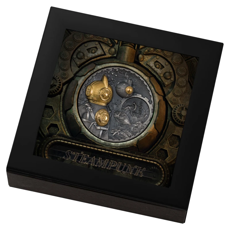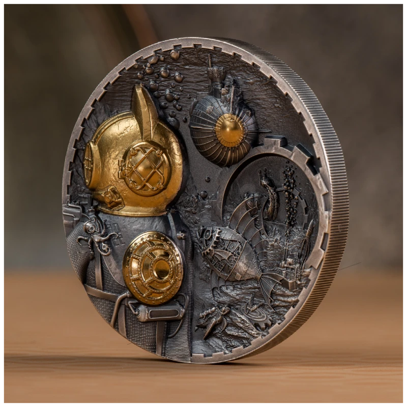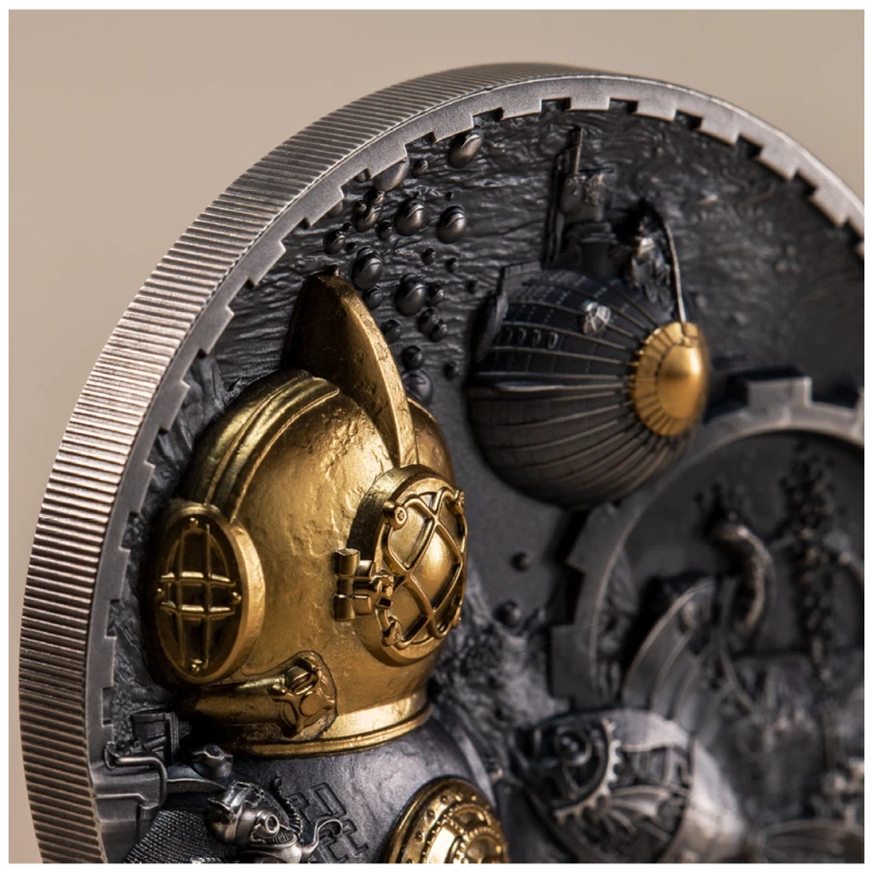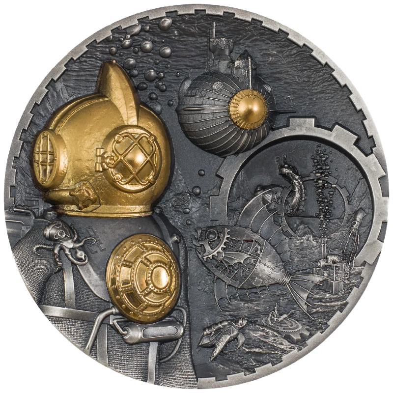 Exclusive silver coin with a lot of fine details and very high relief minting. The coin, in steampunk style, depicts a conqueror of the sea floor, in an armored diving suit, against the background of a departing submarine and a variety of technogenic and mechanical creatures inhabiting the sea and ocean depths.
