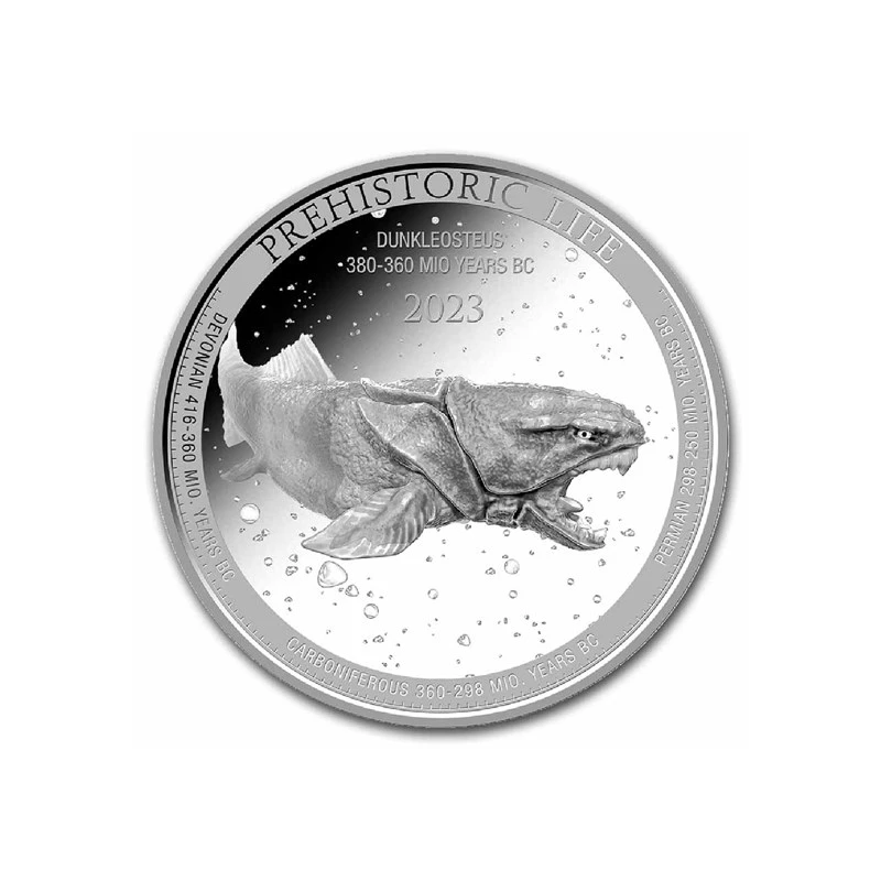This silver coin commemorates the life forms that existed on Earth during the prehistoric era.