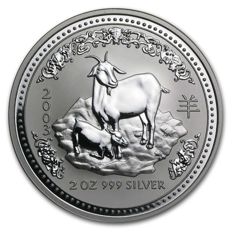 Die Silbermünze 2003 wiegt 2 Unzen und besteht aus 0,999er Feinsilber. Sie ist dem chinesischen Tierkreiszeichen der Ziege gewidmet. Die von der Künstlerin Sarah Anderson gestaltete Rückseite zeigt das Bild einer Ziege mit einem Zicklein vor einem Hintergrund aus Steinen, die Frieden, Harmonie und familiäre Werte symbolisieren. Die Vorderseite zeigt ein Porträt Ihrer Majestät, Königin Elizabeth II. von Ian Rank-Broadley, sowie den Nennwert und das Ausgabeland.