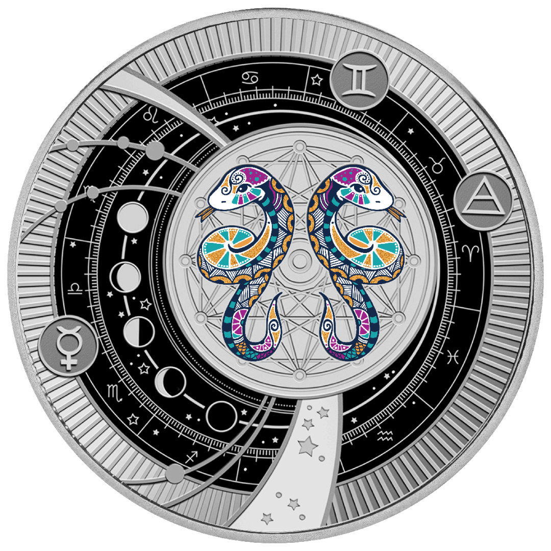 Diese elegante Silbermünze aus der Serie "Zodiac Signs" ist den Zwillingen gewidmet, einem Zeichen, das Dualität, Neugierde und einen unstillbaren Durst nach neuen Erfahrungen verkörpert. Die in polierter Platte geprägte Münze besticht durch ihre leuchtende Farbe und die exquisiten Details. Eine Besonderheit der Münze ist ein eleganter Anhängerring, mit dem sie als stilvolles Schmuckstück getragen werden kann. Auf der Rückseite sind zwei Schlangen abgebildet, die die gespiegelte Einheit der Seelen und die magische Energie der Zwillinge symbolisieren. Die Münze wird in einem Etui mit Echtheitszertifikat ausgegeben und ist weltweit auf nur 599 Stück limitiert.