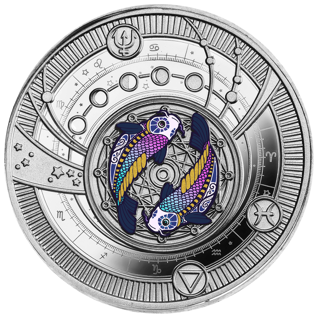 Diese exquisite Silbermünze ist Teil der Serie "Tierkreiszeichen" und ist den Fischen gewidmet, dem geheimnisvollen und sinnlichen Wasserzeichen, das von Neptun regiert wird. Sie verkörpert die tiefe Intuition, Emotionalität und künstlerische Natur der in diesem Zeichen Geborenen. Die Münze wird in polierter Platte geprägt und zeichnet sich durch filigrane Details und einen leuchtenden Farbakzent aus. Mit einem eleganten Anhängerring lässt sie sich als Schmuckstück tragen und unterstreicht den raffinierten Stil und die innere Harmonie ihres Besitzers. Die Münze wird in einem Etui mit Echtheitszertifikat ausgegeben und ist weltweit auf nur 599 Exemplare streng limitiert.