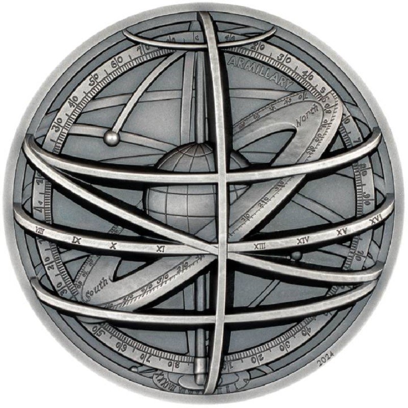 Cook Islands: Silber-Sammlermünze Historische Instrumente. Armillarsphäre 2024 (Ultrahochrelief), 62,2 g reines Silber (0,9999)