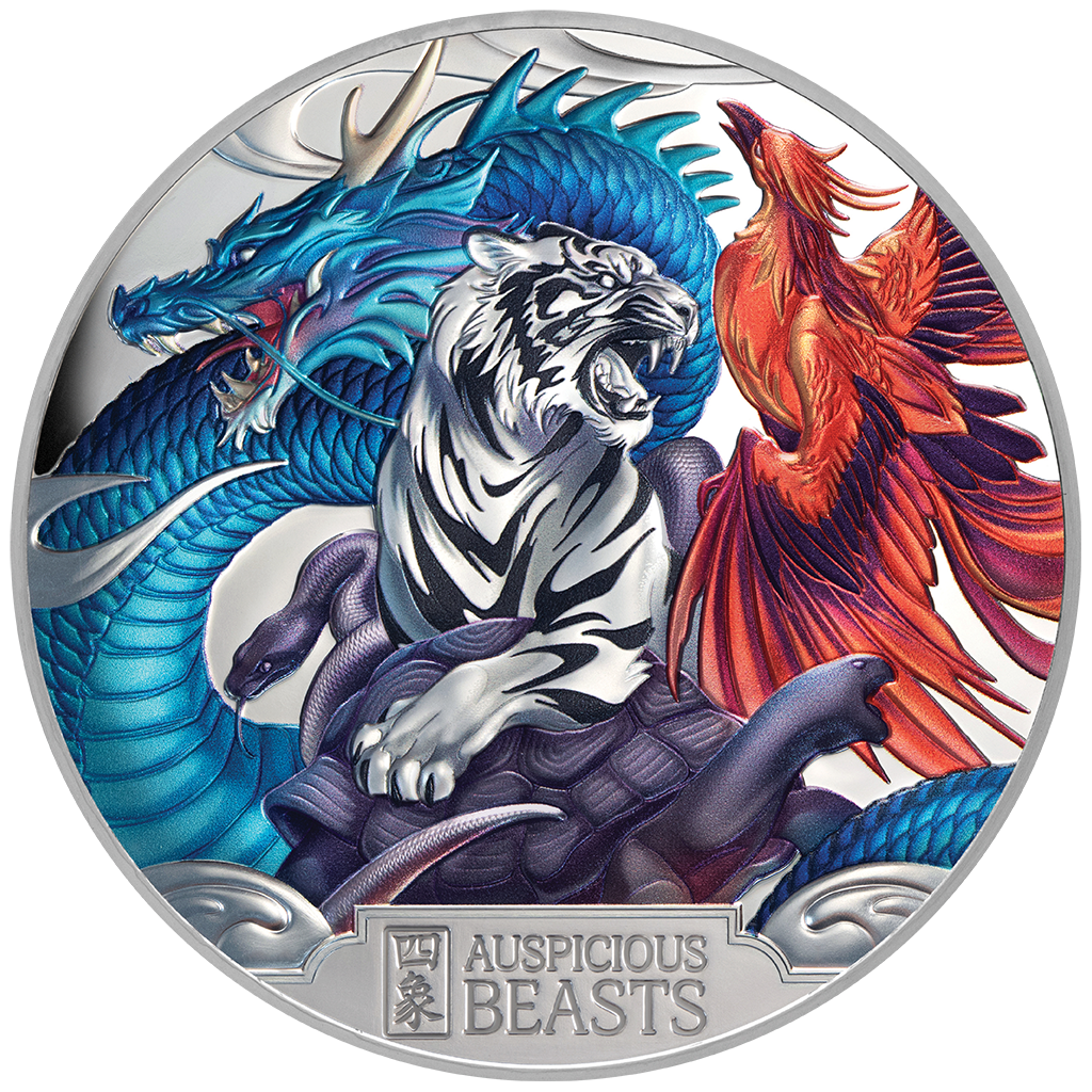 Diese beeindruckende 5-Unzen-Silbermünze verkörpert den Geist der alten Mythologie und die Kraft der vier Auspicious Beasts: den Azure Dragon, den Vermilion Bird, den White Tiger und die Black Tortoise. Ihre dynamischen Formen sind in einer kraftvollen Komposition vereint, in der sich warme, feurige Töne mit kühlen Blautönen vermischen. Die in polierter Platte geprägte Münze besticht durch die Tiefe des Reliefs und das Lichtspiel, das jedes Detail der legendären Wächter hervorhebt. Die Münze wird in einem eleganten Etui präsentiert und von einem Echtheitszertifikat begleitet. Die Auflage ist streng limitiert auf 388 Stück weltweit.
