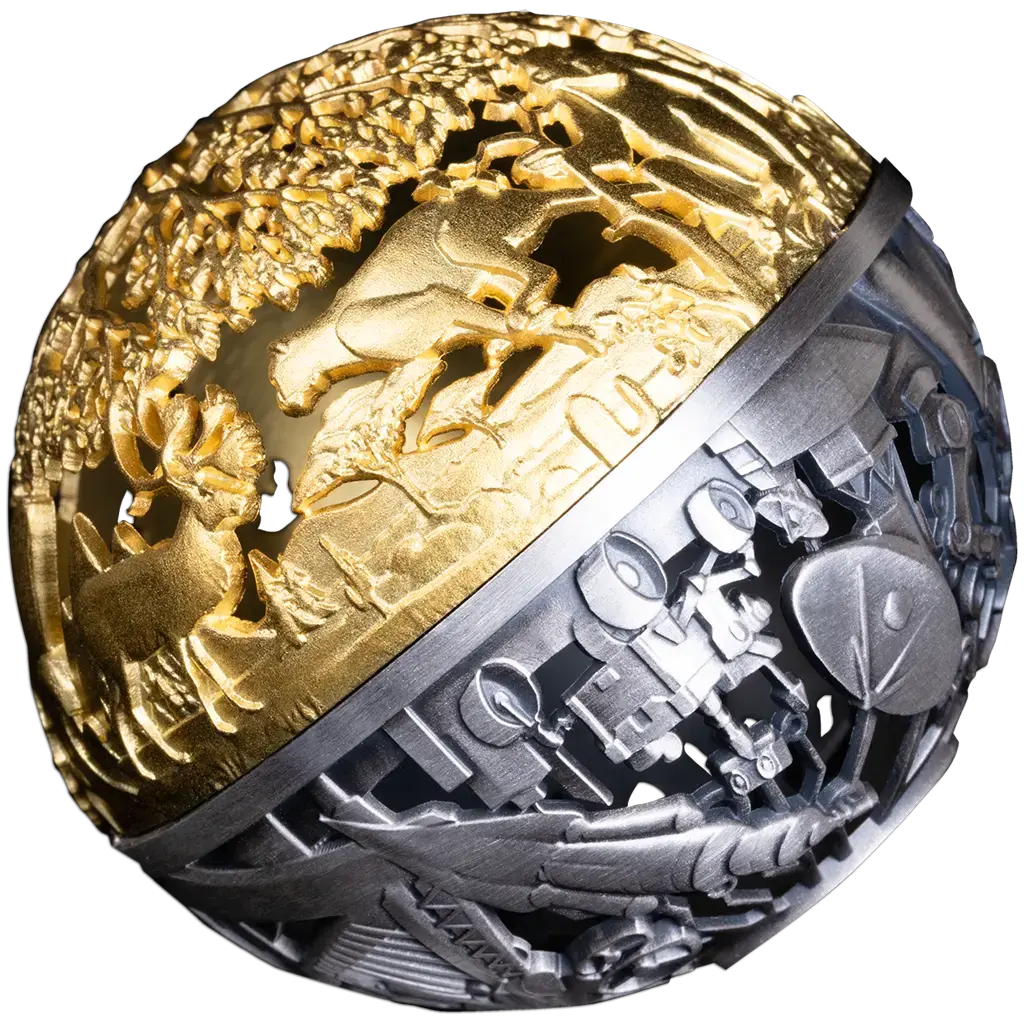 Diese außergewöhnliche kugelförmige 2-Unzen-Silbermünze verkörpert die Harmonie zwischen den Urkräften der Natur und dem rasanten technologischen Fortschritt der Menschheit. Ihre ungewöhnliche Form unterstreicht das Konzept des Gleichgewichts und verleiht dem Design einen ausgesprochen futuristischen und einprägsamen Charakter. Das Antik-Finish in Kombination mit feinsten Filigranarbeiten und einer 24-karätigen Vergoldung unterstreicht die Tiefe des künstlerischen Konzepts und die handwerkliche Qualität der Münze. Die Münze wird in einem Etui mit einem Echtheitszertifikat geliefert. Die Auflage ist auf weltweit nur 1.499 Stück begrenzt.