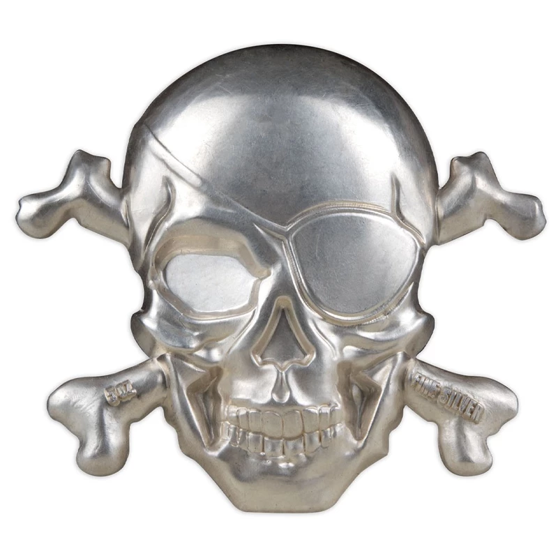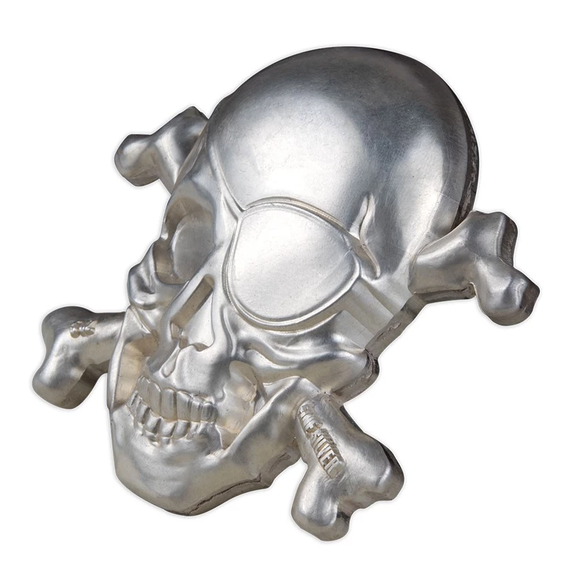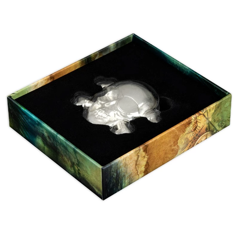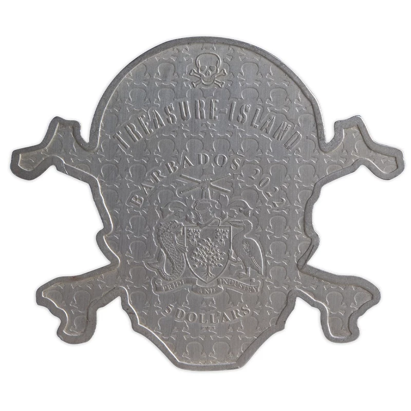 Silbermünze von Barbados "Treasure Island, Skull" 2022, 155,5 Gramm reines Silber (0,999 Proof).