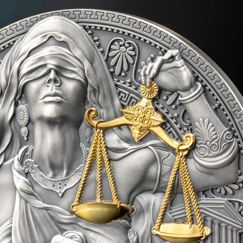 Kameruns einzigartige Silbermünze zeigt die Göttin der Gerechtigkeit, Themis. Sie wird traditionell mit verbundenen Augen und einer Waage in der Hand abgebildet.
