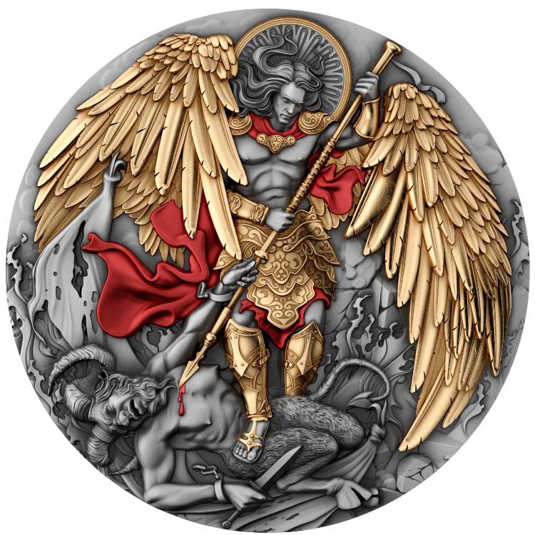 Diese einzigartige 2-Unzen-Silbermünze ist dem Triumph der Gerechtigkeit und dem Schutz der Menschheit gewidmet, verkörpert durch das Bild des mächtigen himmlischen Kriegers des Lichts, des heiligen Erzengels Michael. Mit dem Schwert der Rechtschaffenheit und Gerechtigkeit symbolisiert er den Sieg des Guten über das Böse. Die Münze hat ein antikes Finish, wird durch eine selektive Vergoldung ergänzt und wird in einem repräsentativen Etui mit einem Echtheitszertifikat geliefert. Die Prägung ist streng limitiert - nur 500 Stück weltweit.