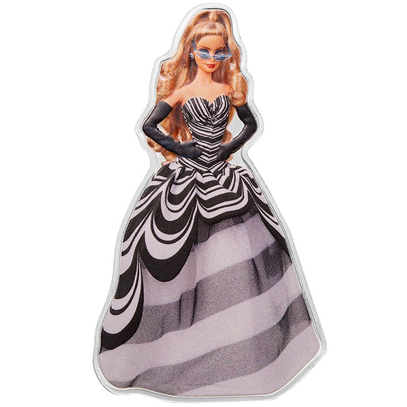 Eine Silbersammlermünze von den Salomonen, ausgegeben im Jahr 2024 und geprägt aus 1 oz 0,9999 Feinsilber. Diese raffinierte Ausgabe feiert den 65. Geburtstag von Barbie und gehört zur Serie Blue Sapphire. Die Münze hat die einzigartige Form der Barbie-Silhouette und besticht durch ihre leuchtende Farbgebung und ihr markantes Design. Die Komposition spiegelt den ikonischen Stil der legendären Puppe wider: ein elegantes schwarz-weißes Kleid mit einem auffälligen Muster und eine modische Sonnenbrille. Das künstlerische Konzept verbindet moderne Ästhetik mit wiedererkennbaren Popkultur-Symbolen. Die Münze wird in einem Etui mit einem Echtheitszertifikat präsentiert. Die Auflage ist streng auf 3.000 Stück weltweit begrenzt.