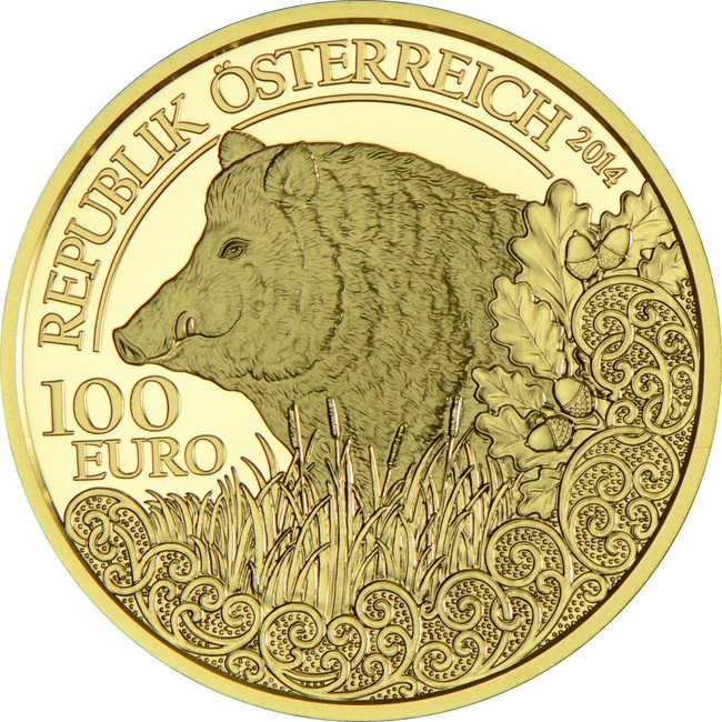 Österreichische Goldmünze "Wildlife. Wildschwein" Proof, 2014, 16 g. reines Gold (0,986 Proof)
