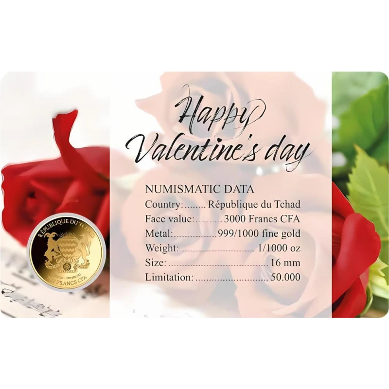 Tschads Goldmünze "Valentinstag" (Proof), 0,031 g. reines Gold (0,999 Proof)
