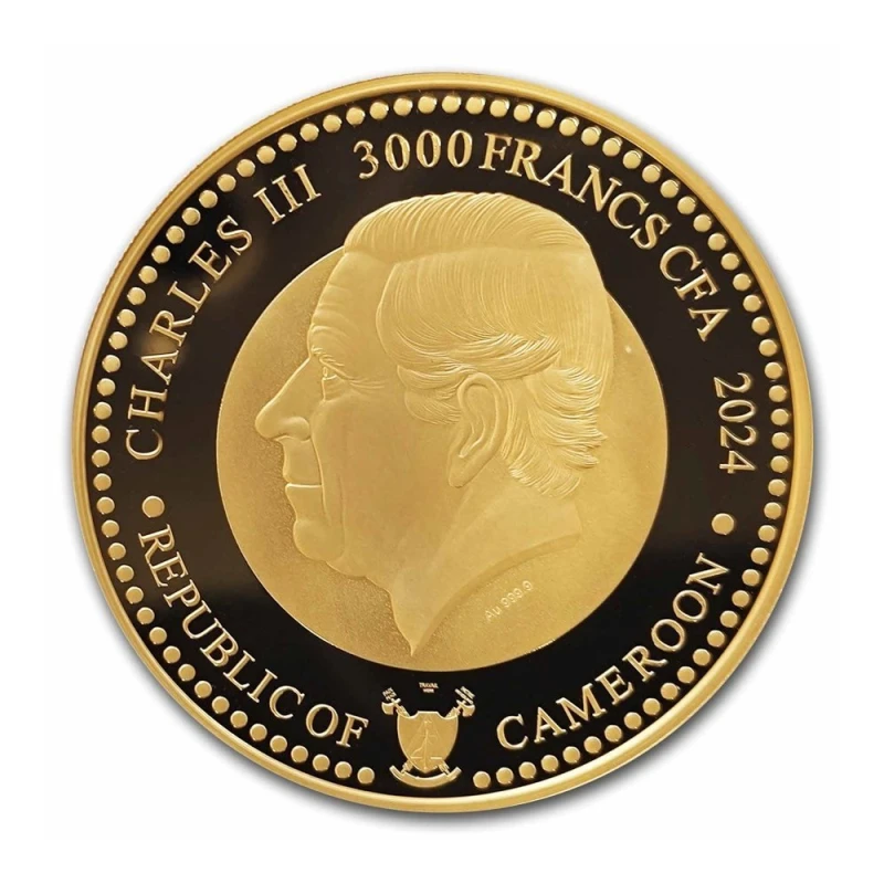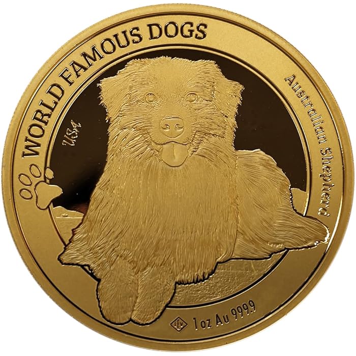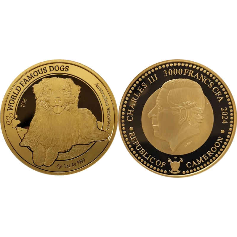 Goldmünze Kamerun "Australian Shepherd" 2024, 31,1 g. reines Gold (0,9999 Proof).