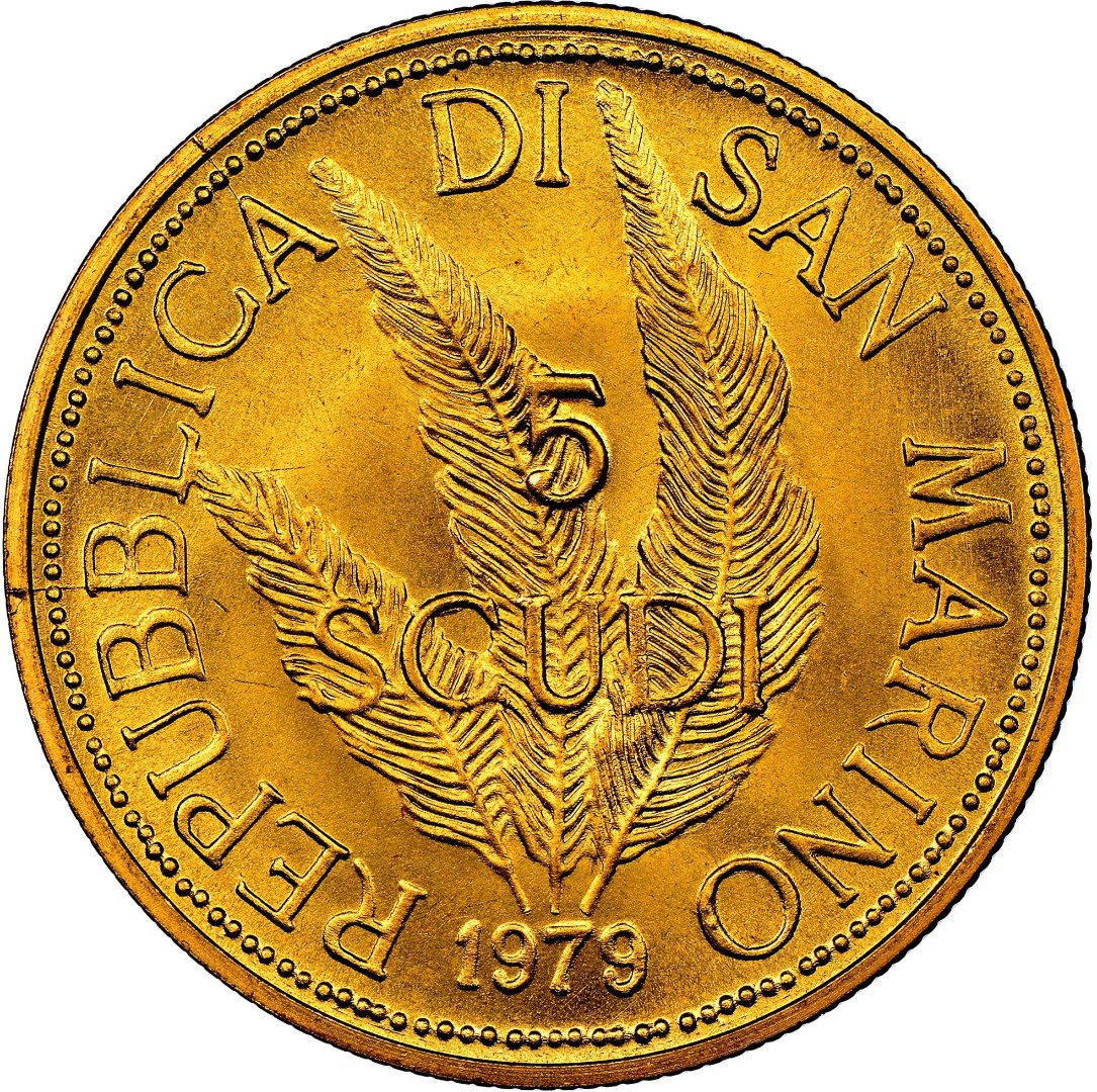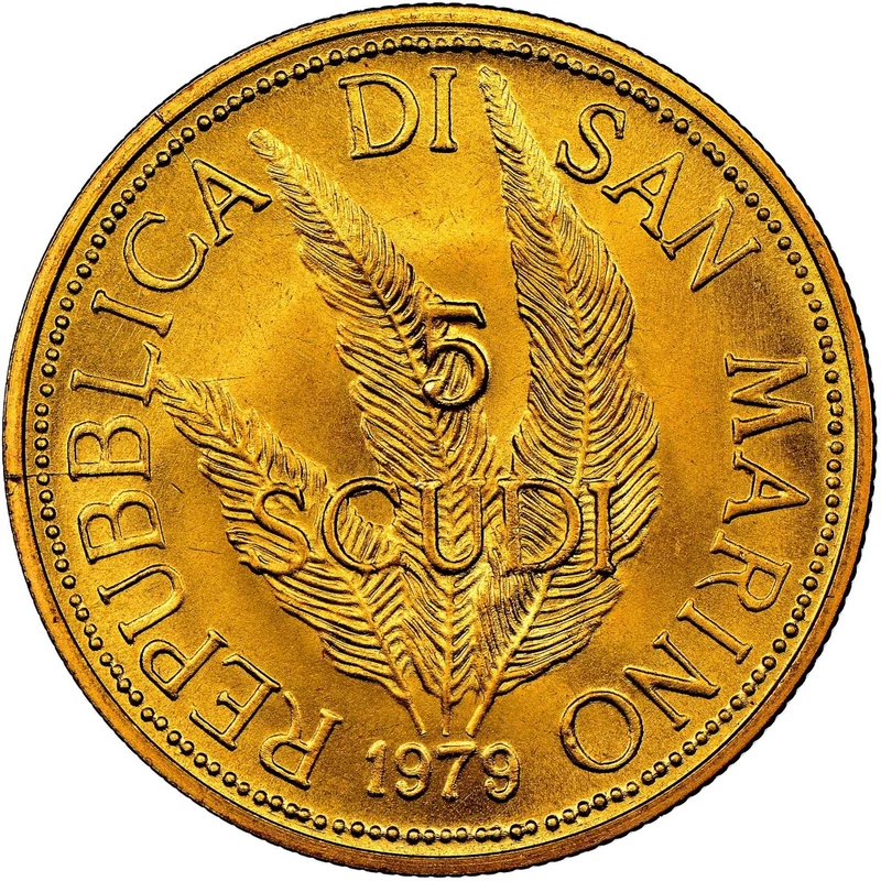 Dynamik der Preisänderung Goldmünze San Marino "5 Scudi" 1979, 15,0 g., reines Gold (0,917 Proof).